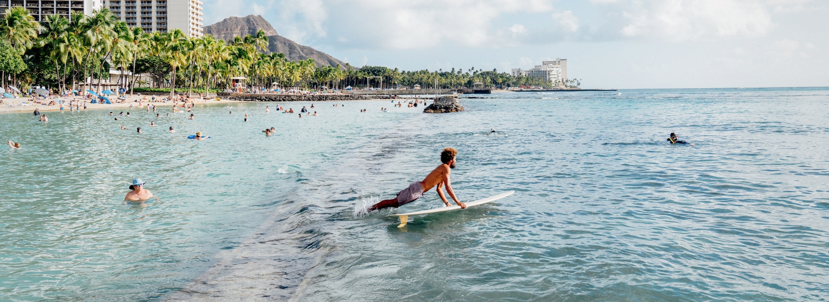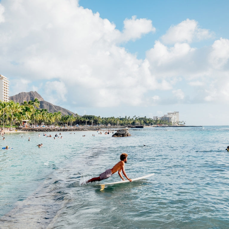 During the mid-century boom, Beach Boys culture flourished as the advent of the jet engine and statehood ushered in a wave of American tourism to Oʻahu, solidifying Waikīkī’s image as the ultimate paradise. Through it all, surfing remained a constant thread, with Waikīkī’s waters consistently producing some of the world’s most gifted watermen and women. Today, Waikīkī is an eclectic mix of commerce, community, and culture. Generational families still call it home, carrying forward a deep-rooted legacy of love for the land, the waves, and its history.